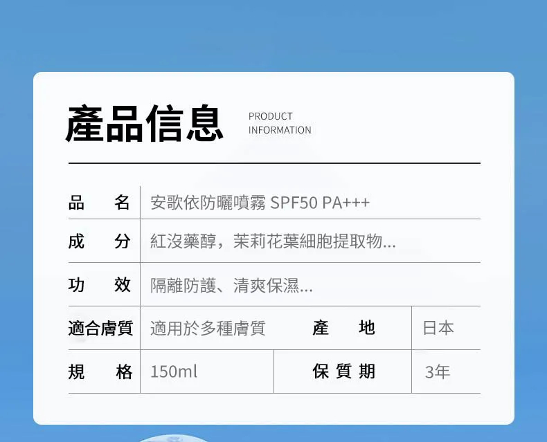 20分鐘前安歌依光圈防曬噴霧,細密噴頭設計 噴頭360°可旋轉自然膚惑,隔離防曬一瓶搞定 - 限時搶購「安歌依光圈防曬噴霧」2入78%用戶的選擇!NT$998【限時免運】